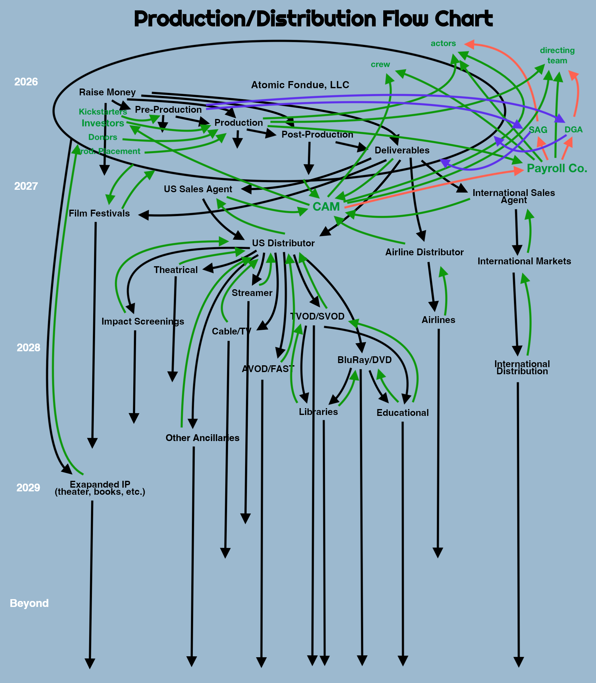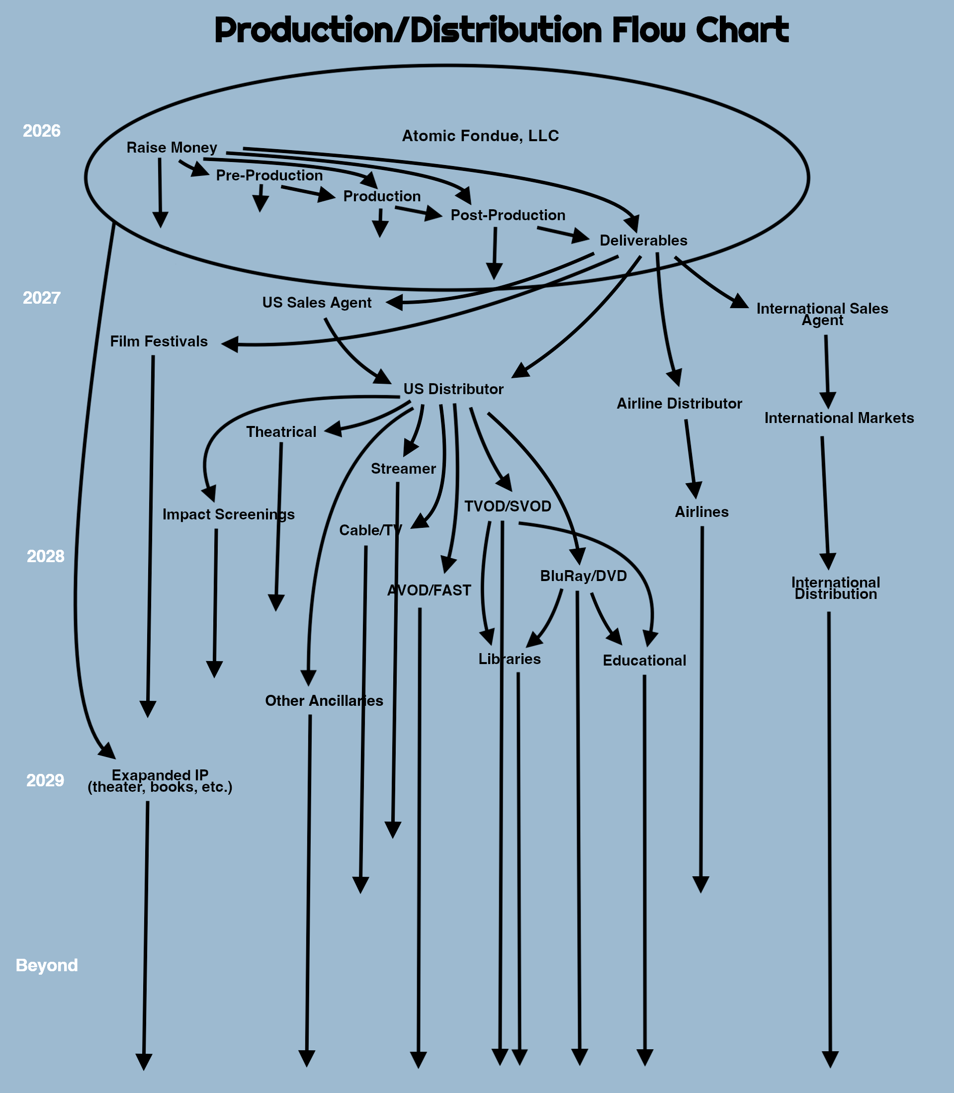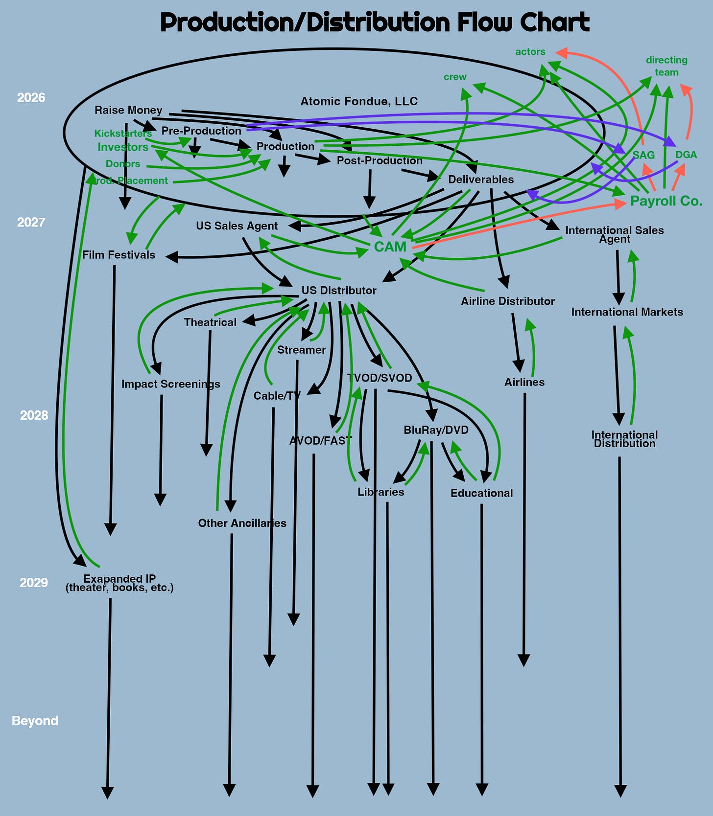 After all the great responses to my Film Fundraising Flowchart last week, I thought I’d post another set of flowcharts. In the interest of NonDê full disclosure, here’s one chart we’re using internally on my upcoming film Atomic Fondue (our Kickstarter campaign starts next week)! Now that we’ve got our LLC formed, bank account, etc., we’re hitting 2026 hard to raise money, start pre-pro and make the film.