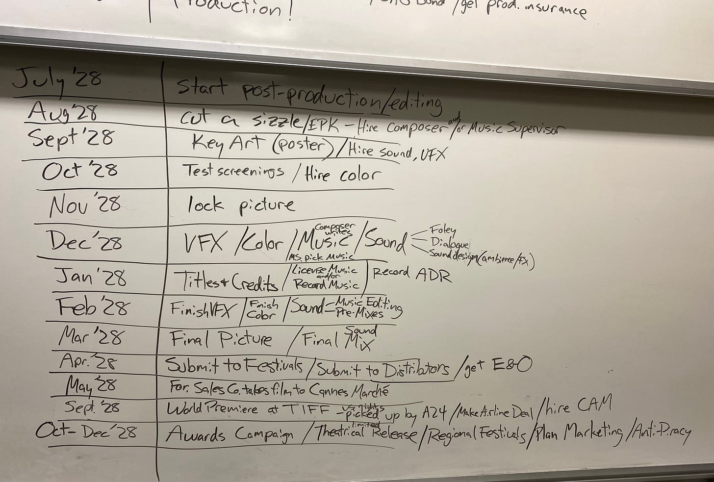 Of course, when you teach film students, they all think their film is going to get picked up by A24. It’s tough to inject complete realism without also crushing their spirits too much. (As faculty, we do want them to come back again next semester.) But I think the real emotional takeaway that a graphical schedule like this does for students and working filmmakers alike is that making a movie takes a LONG TIME!