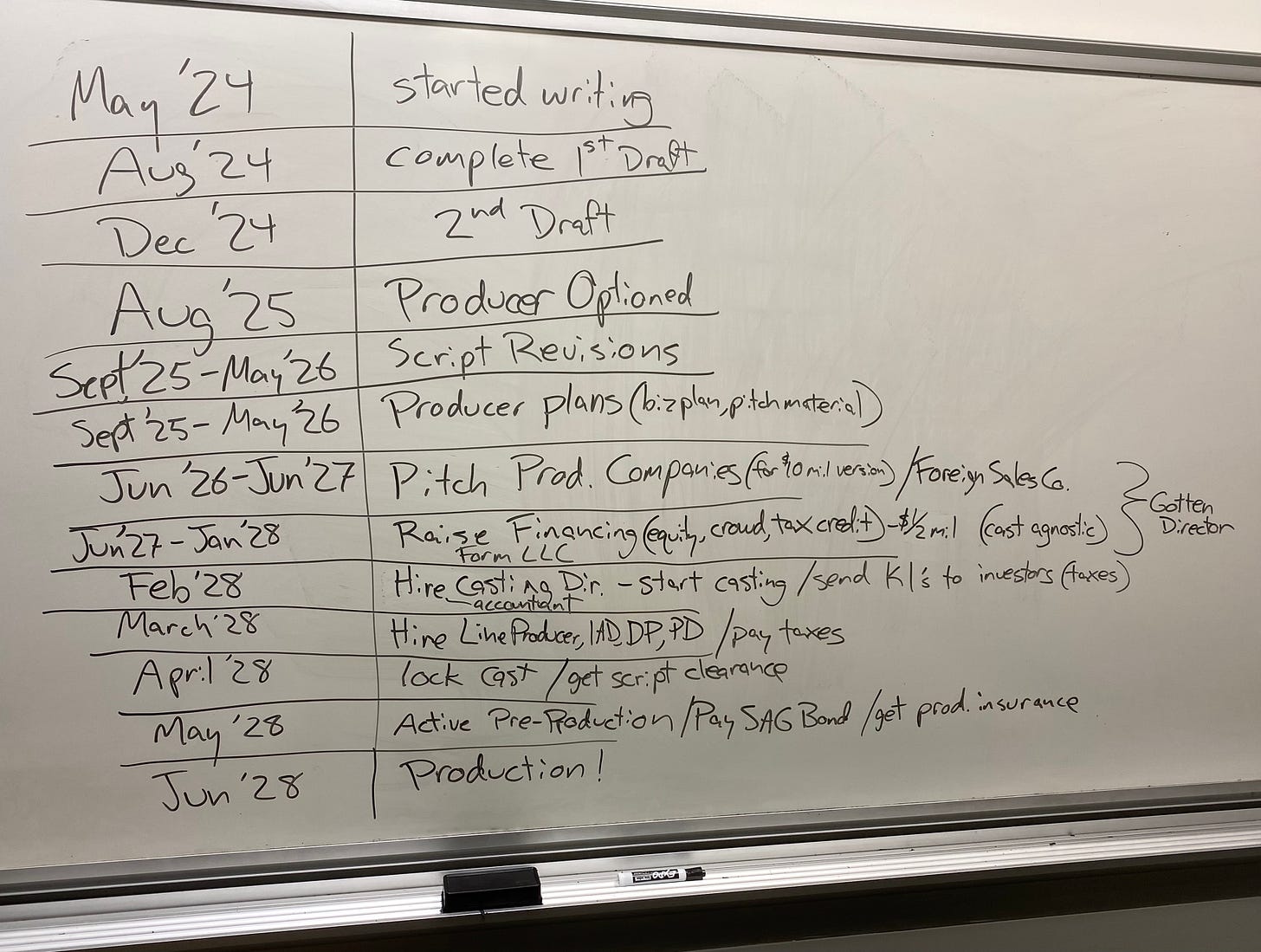 So in my graduate producing class at Chapman University this week, my students and I took advantage of our rolling phalanx of white boards in the room to do something similar. No apps necessary: Just OG huffing dry-erase fumes in a windowless room to get the creative juices flowing! So here’s the long-term schedule we came up with for a (mostly) hypothetical film one of the students has in class:
