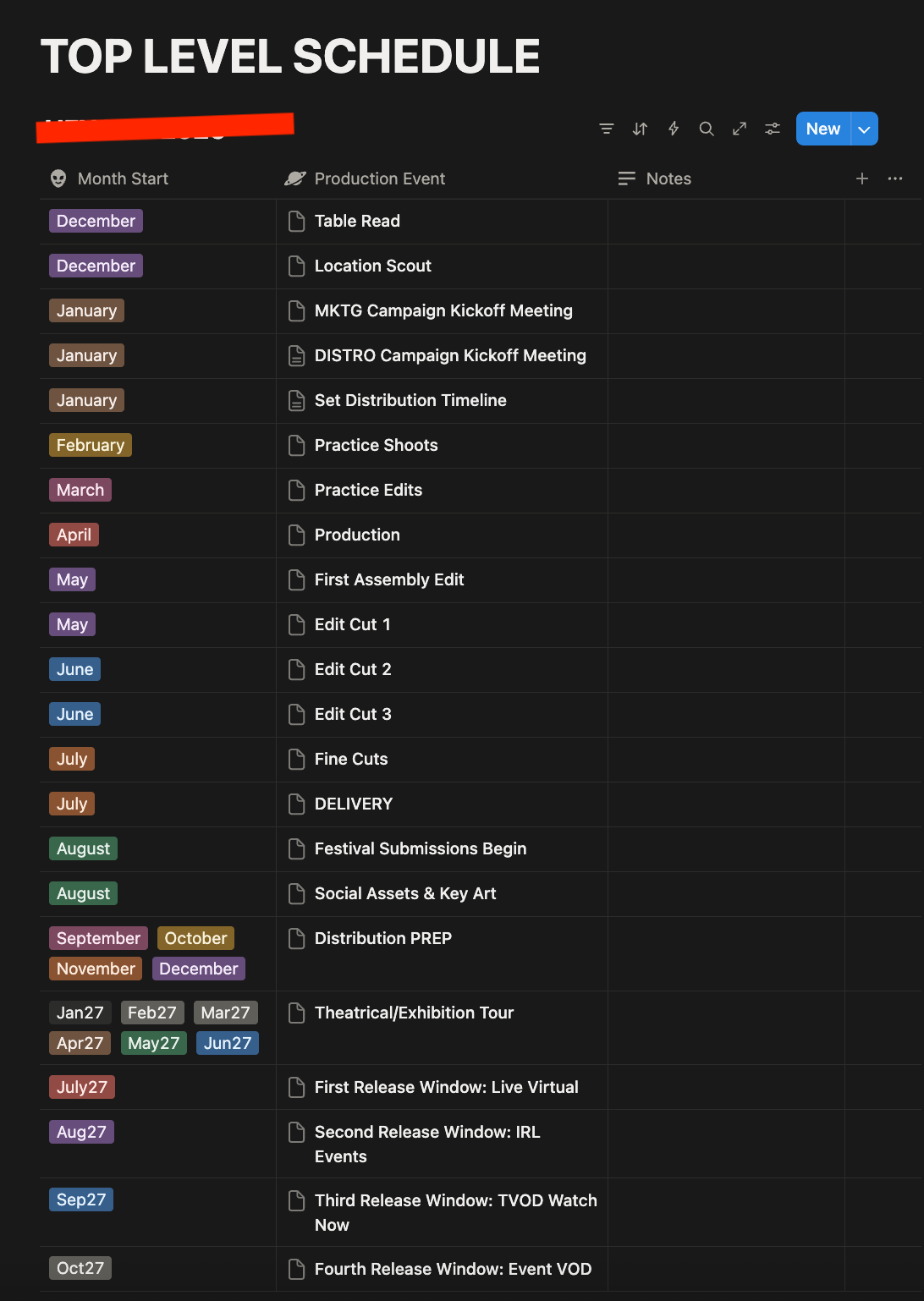 This got me thinking about lower tech versions of how to do a long-term schedule, and perhaps more importantly, what to schedule. My own comments to Courtney as well as many others praised her for her comprehensive and rigorous schedule, as well as being so transparent about sharing it with our FilmStack community. (I blocked our her title in cases she changes her mind about how much transparency she wants lingering on the internets :)