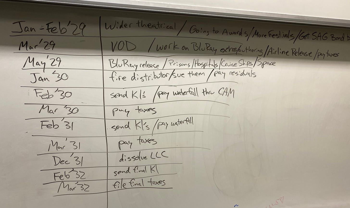 In our little example, from screenwriting to filing final taxes takes at least 8 years. And believe me, if we’d had more white boards, we easily could have extended this schedule another 8-30 years with everything from archiving, getting new distribution, suing that distributor, other IP exploitation (it’s a play! it’s a graphic novel!), re-releasing on some fancy new digital platform (Google contact lenses!), retrospective screenings, tracking down investors’ heirs, securing your own heirs, etc.